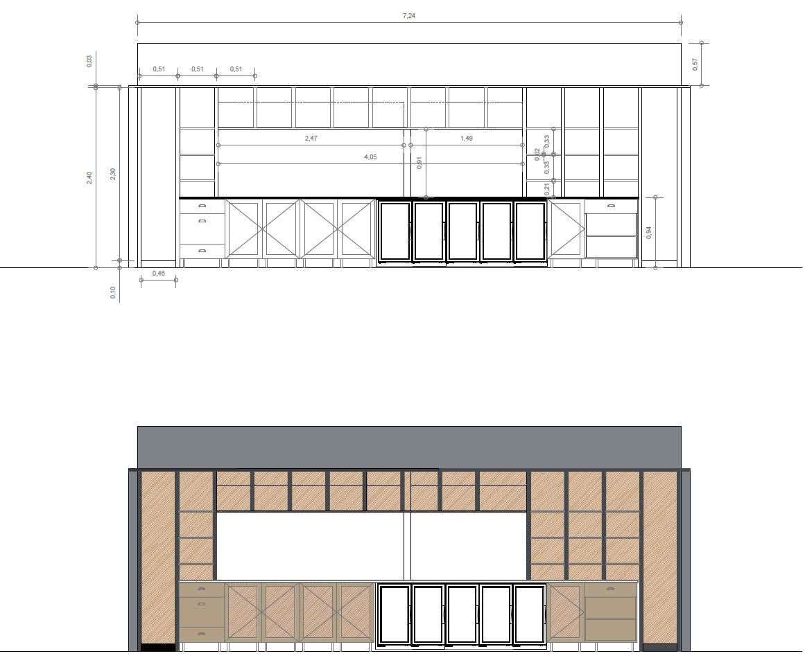 A partir de este núcleo central se despliega una amplia encimera que funciona simultáneamente como doble barra, integrando en un único elemento arquitectónico tanto la zona de cocina abierta como el servicio de bebidas. Esta solución refuerza la continuidad visual y funcional, generando un espacio dinámico de interacción directa entre clientes y personal.